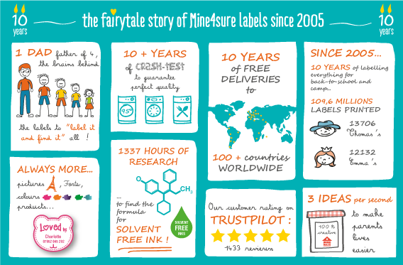 Because practicality does not need to be boring, mine4sure offers a wide range of colours and fonts : from the most classic to the most modern. You also have the possibility to add a fun picture to your labels.